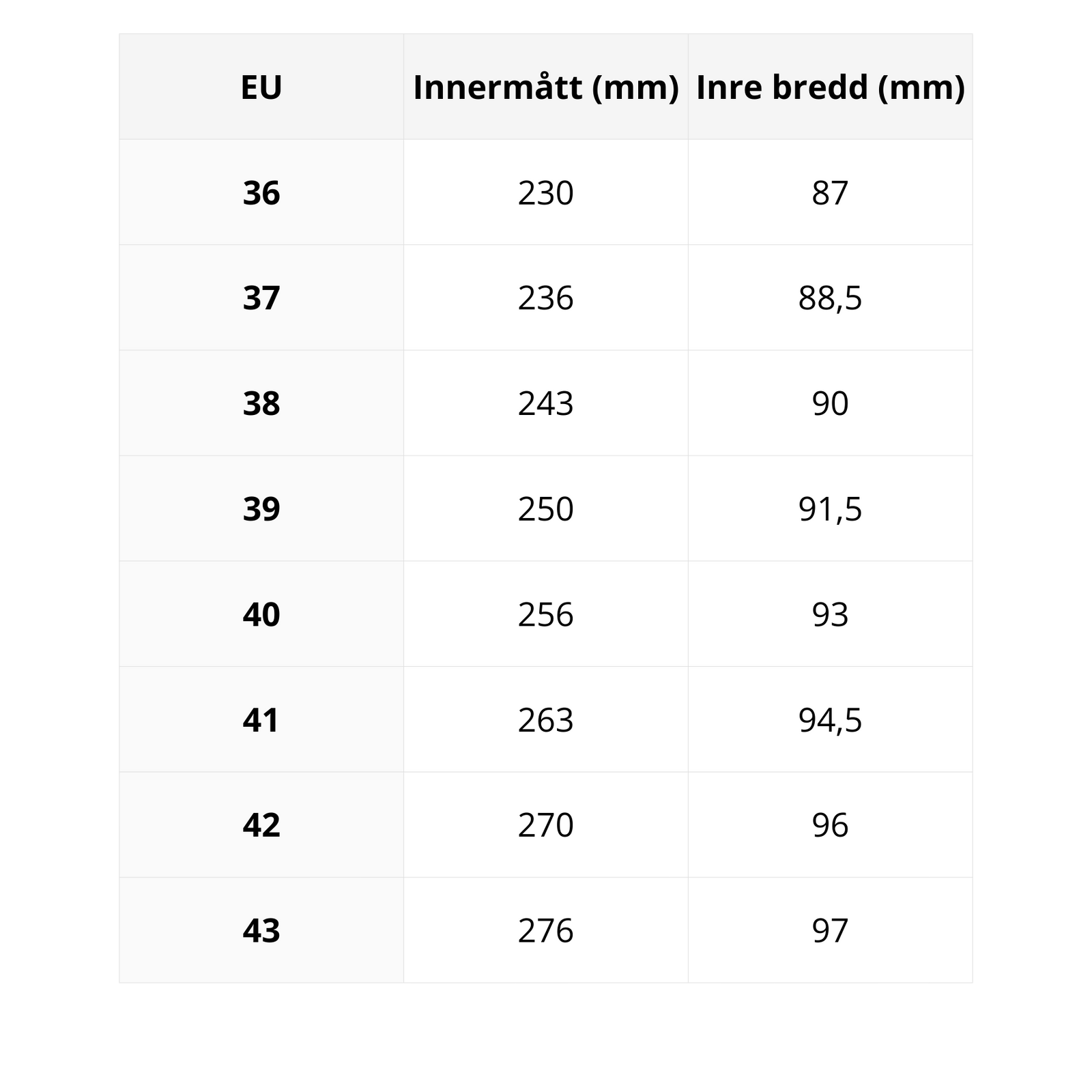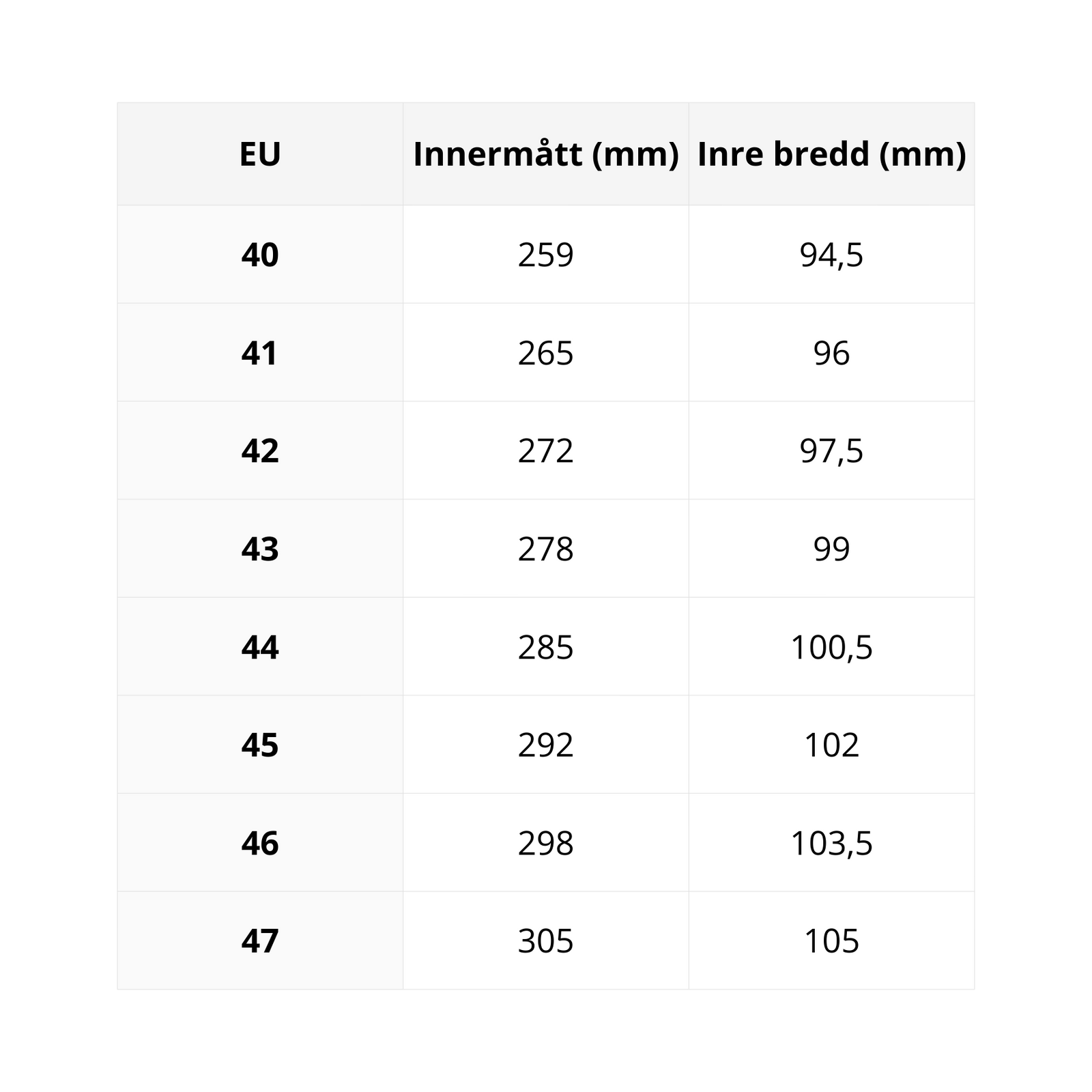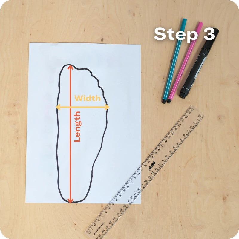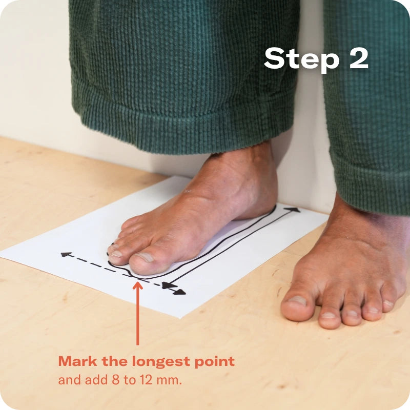 Mät avståndet mellan de två markeringarna för båsfötterna, lägg till 8-12mm för att säkerställa att de har rätt utrymme och omvandla enligt tabellen ovan. Om dina fötter har två olika storlekar, använd längden på din större fot när du jämför med storlekstabellen.