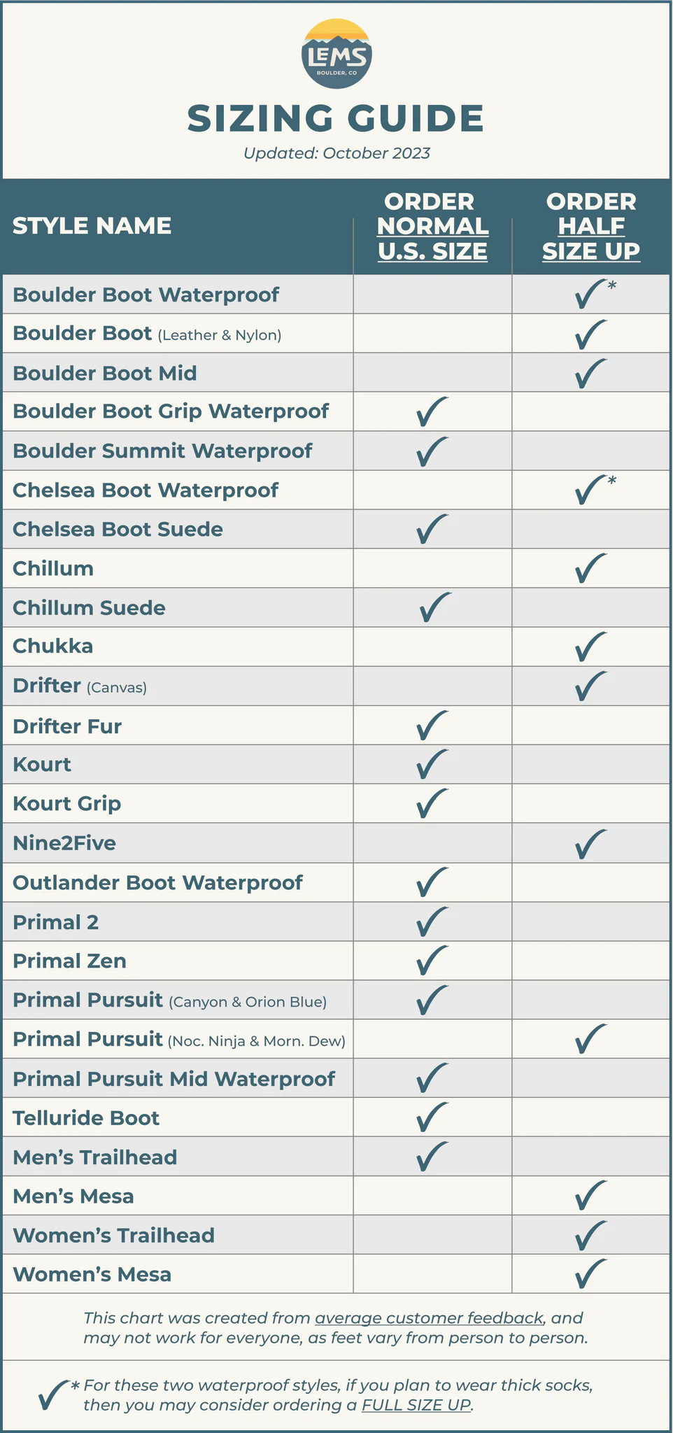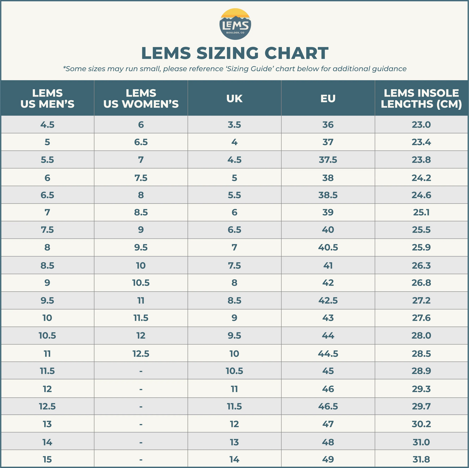 Tänk på att denna tabell endast visarinnermåttet på skorna från Lems