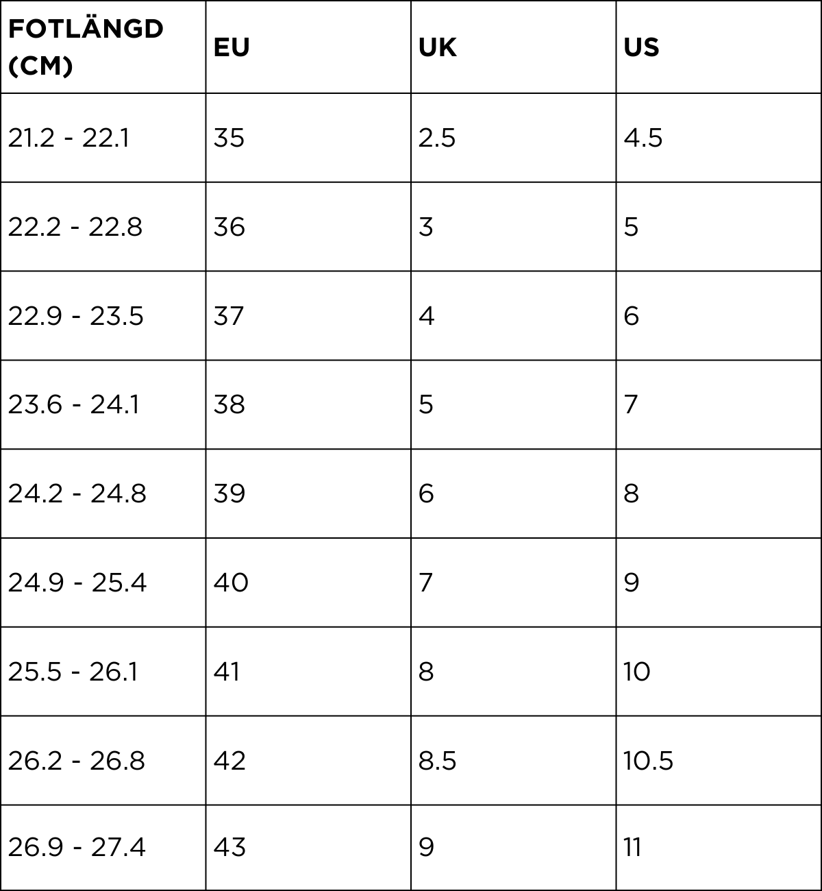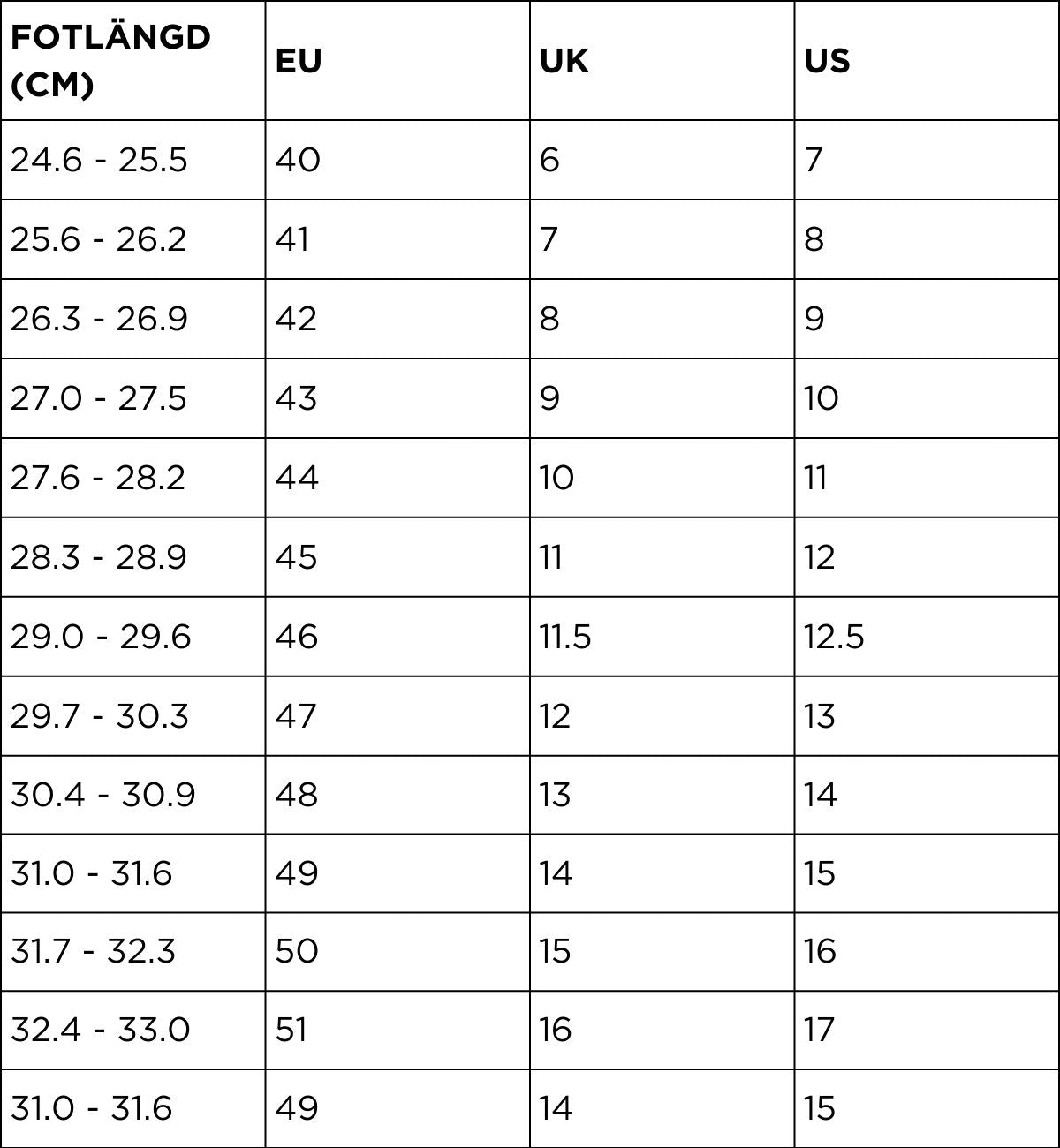 Använd vår konverteringstabell nedan för att räkna ut din rekommenderade passform.